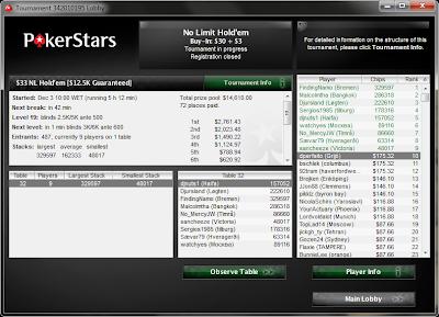 Cheguei ao intervalo para jantar com 19k e as blinds iam subir para 1500/3000-500. Após o jantar eu tinha que dobrar a qualquer custo! Na 1ª mão depois do jantar estou no botão e o jogador à minha direita abre de novo e eu faço fold de T7o que certamente iria shovar se não houvesse acção até mim. Na mão seguinte todos fazem fold até mim e eu vejo J9o no CO... All-in! Botão fold, SB fold, BB call e mostra 33. Vem um 3 no flop e eu estou quase morto... no turn ainda fico com gutshot e flush draw, mas não pintou no river. Fui eliminado no 136º lugar.